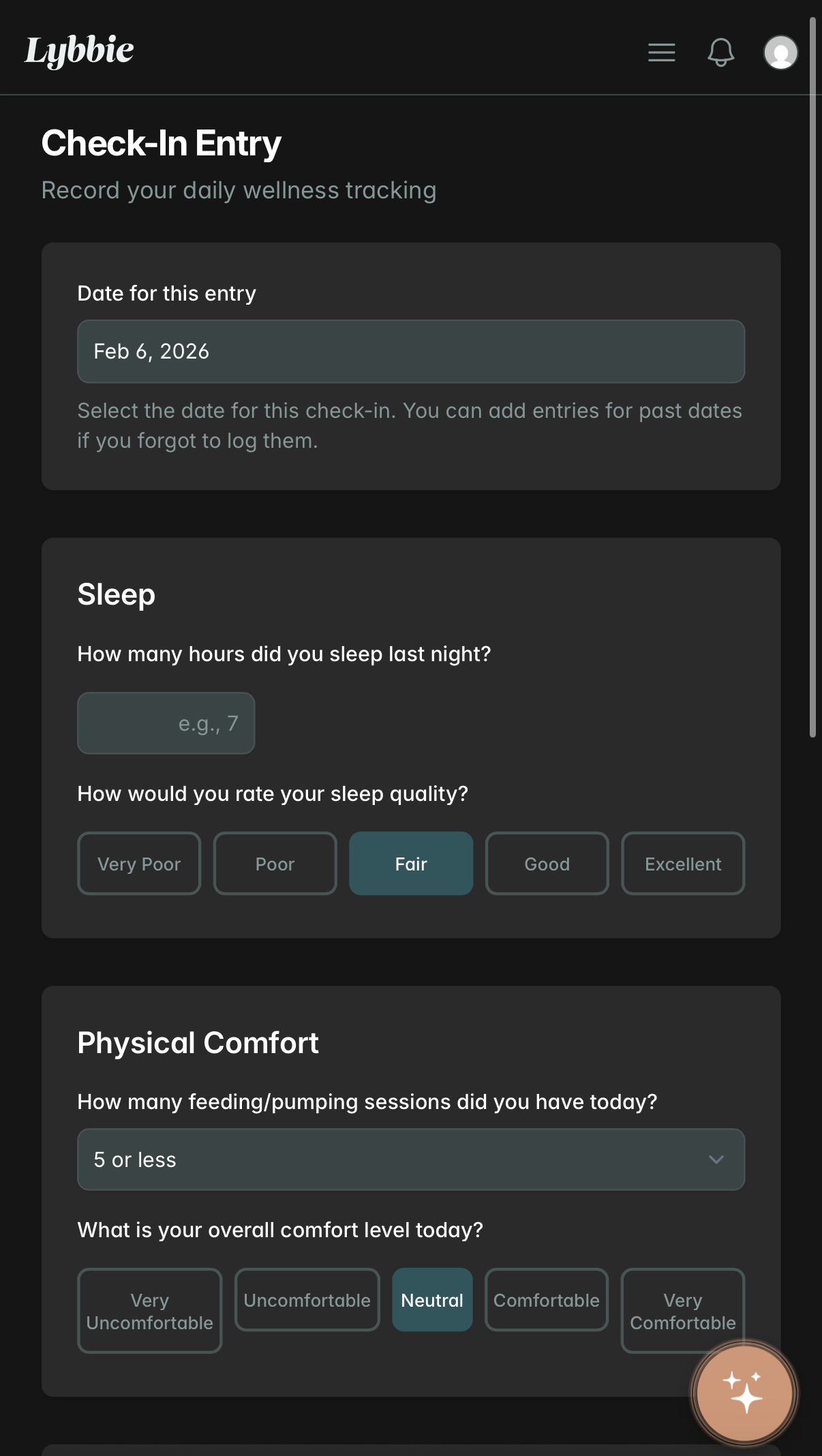 Through daily self check ins, individualized trends, and on demand, evidence based guidance, Lybbie helps moms build confidence, reduce anxiety, and better understand their own bodies.